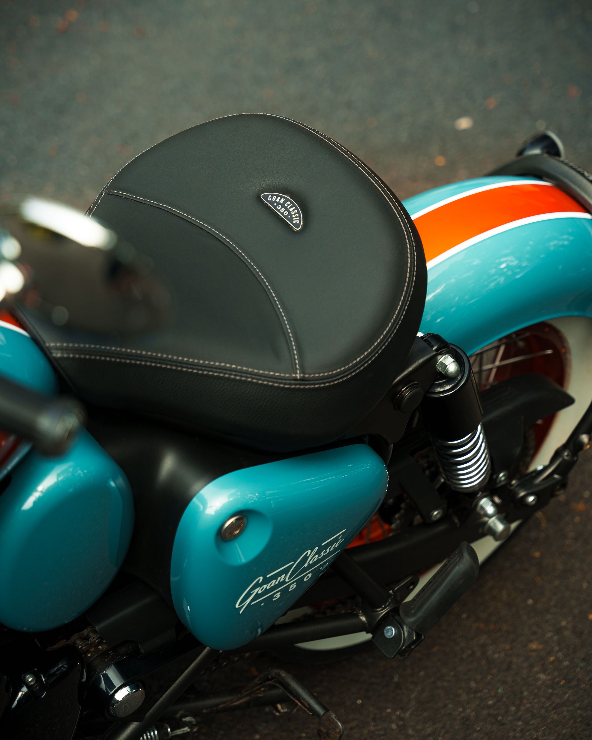 Goan Classic 350 vine echipat cu jante din aluminiu spițate și anvelope tubeless cu flanc alb. Roata față de 19” și cea spate, mai mică, dar mai lată, de 16”, dau motocicletei o siluetă întinsă și joasă, subliniind stilul bobber.